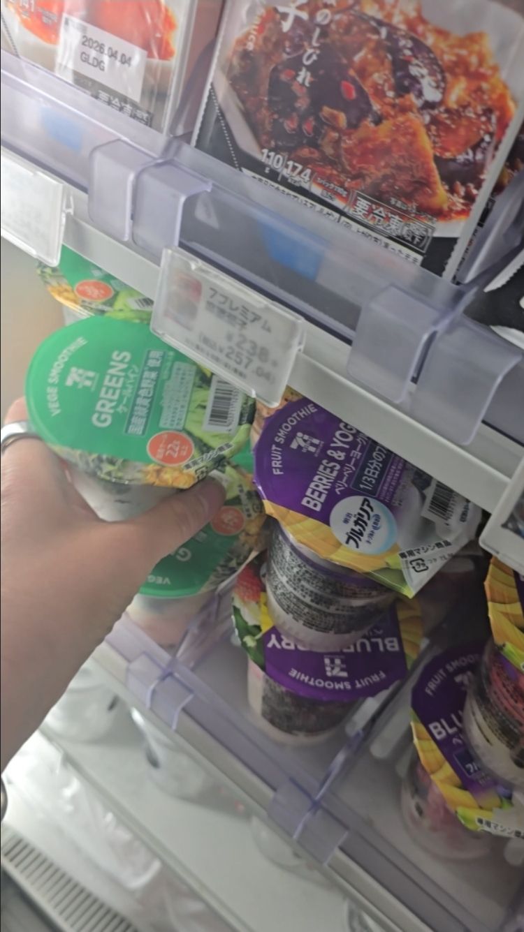 7-Eleven Japan smoothie, healthy breakfast in Tokyo, Tokyo travel vlog, Japan convenience store food, smoothie machine Japan, healthy travel snacks, green smoothie in Japan, 7-Eleven Tokyo experience, Japanese vending smoothie, Siva McAteer travel blog.