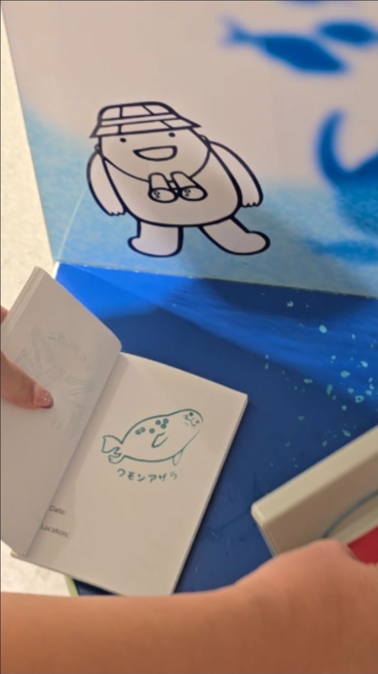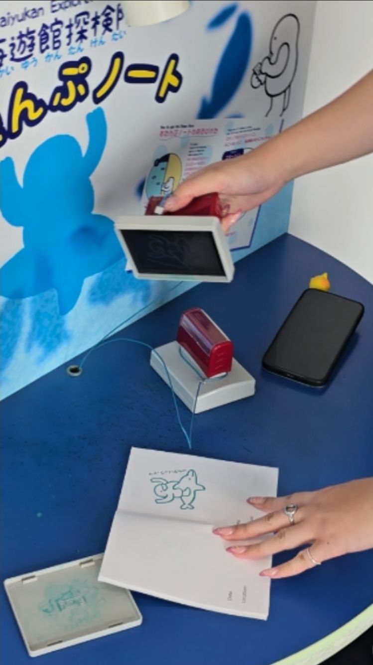 β¨ Don’t Forget Your Eki Stamp Book! Before even stepping inside, here’s my favorite little travel hack: bring your Eki Stamp Book! π If you’ve never heard of it, Japan has a long tradition of collecting stamps (called eki stamps) at train stations, tourist spots, and attractions. I was worried I wouldn’t get mine stamped since we hadn’t taken trains on this trip… but jackpot! π The aquarium has plenty of adorable stamps just waiting for your collection. It’s such a fun and inexpensive way to capture memories while traveling Japan.